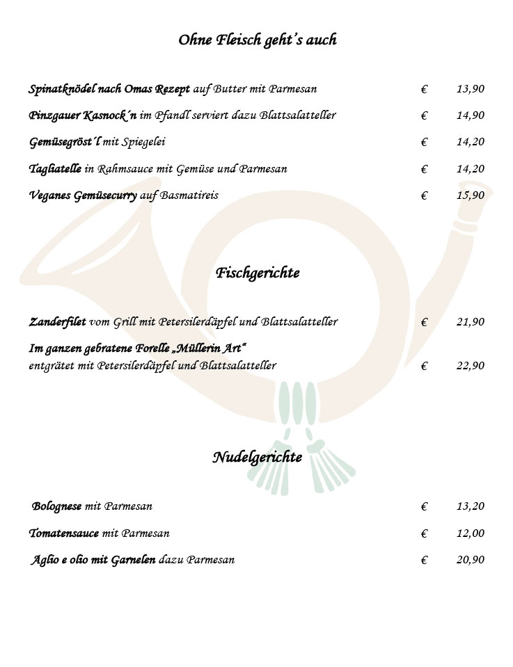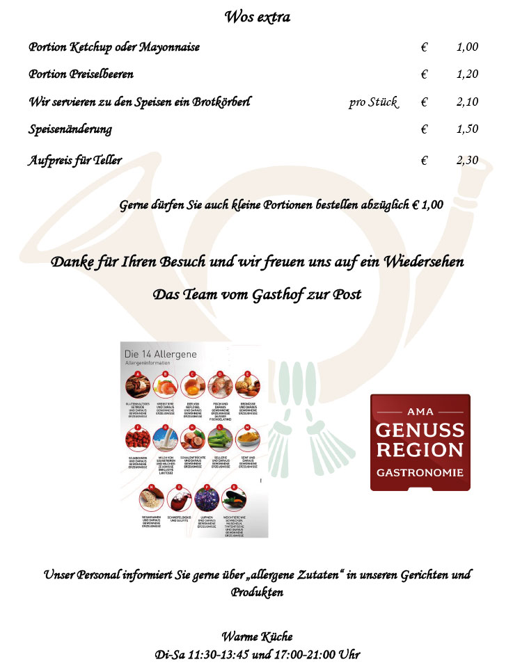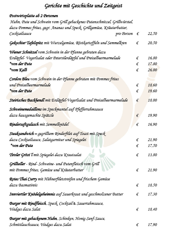 Auf der Speisekarte in unserem Restaurant Gasthof zur Post in Seekirchen am Wallersee können Sie aus traditionellen österreichischen Speisen vom Tafelspitz über das Wiener Schnitzel bis zum luftigen Kaiserschmarrn wählen. Wir veranstalten auch immer wieder Spezialitätenwochen mit besonderen Schmankerln – selbstverständlich frisch zubereitet!